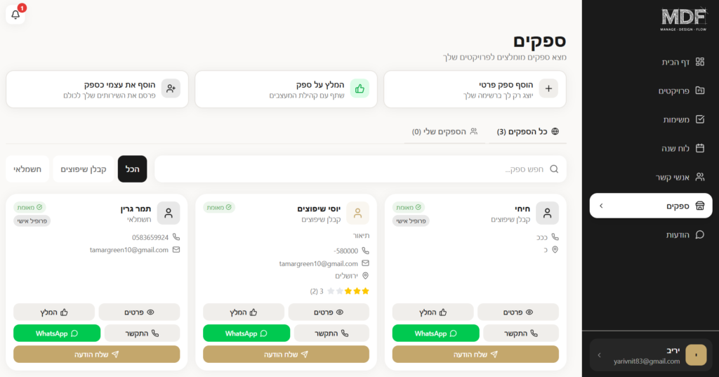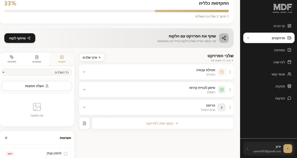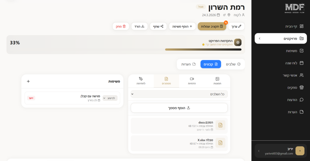 Manage.Design.Flow: MDF - היא פלטפורמה שנבנתה במיוחד למעצבי פנים. היא מרכזת את כל ניהול הפרויקטים, התקשורת עם הלקוחות, המסמכים והתקציב במקום אחד, בשפה ובתהליכים שמתאימים לעולם העיצוב.
