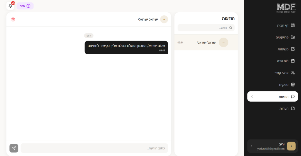 ריכוז כל ההתכתבות עם הלקוח בתוך הפלטפורמה, כדי להפריד את העבודה מהוואטסאפ הפרטי.